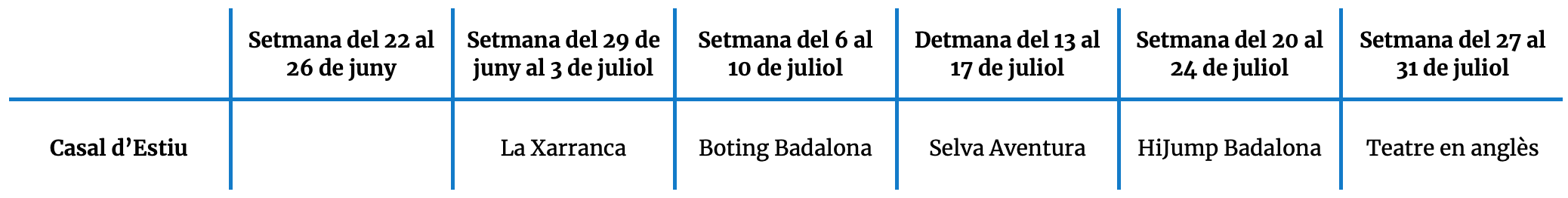 Té una durada de sis setmanes i per a cada una, se segueix un fil conductor i uns eixos temàtics. Cadascun d’aquests eixos, pretén despertar la motivació, la curiositat i l’interès en l’alumnat. A més comptarem amb una sortida cada setmana d’allò més divertida!